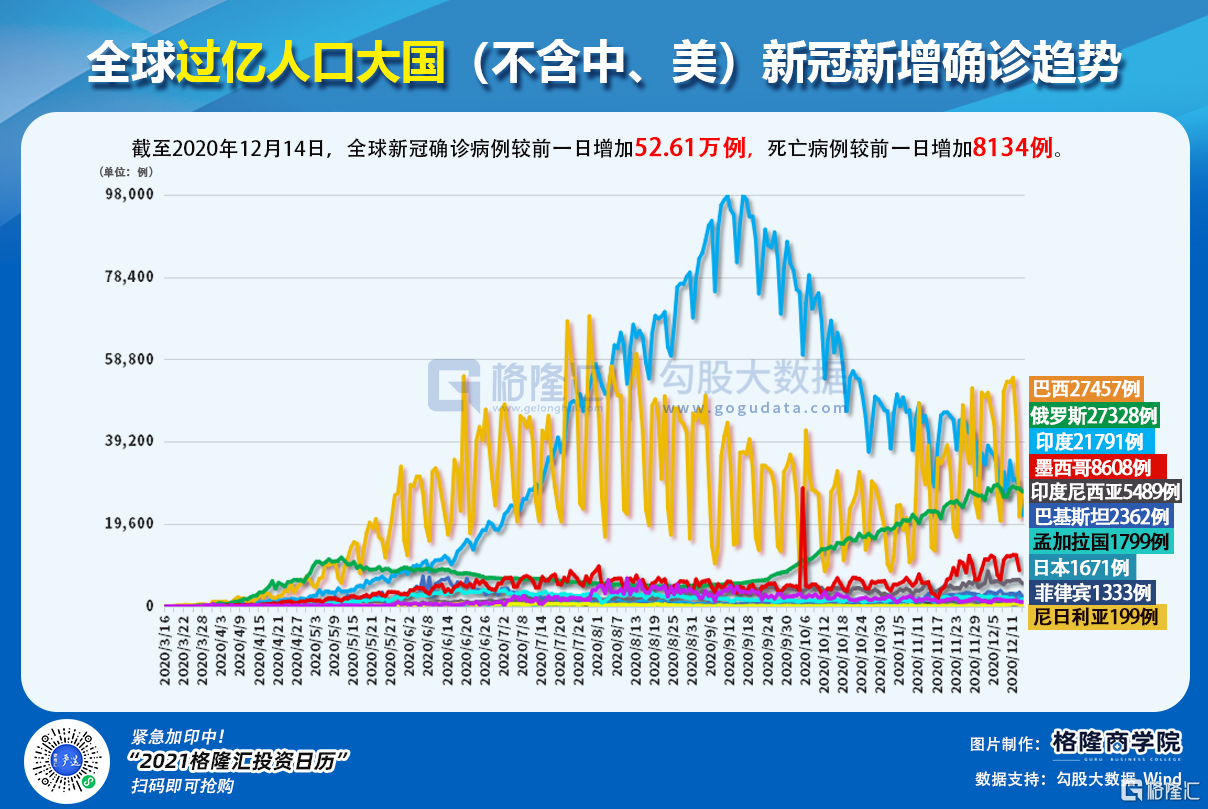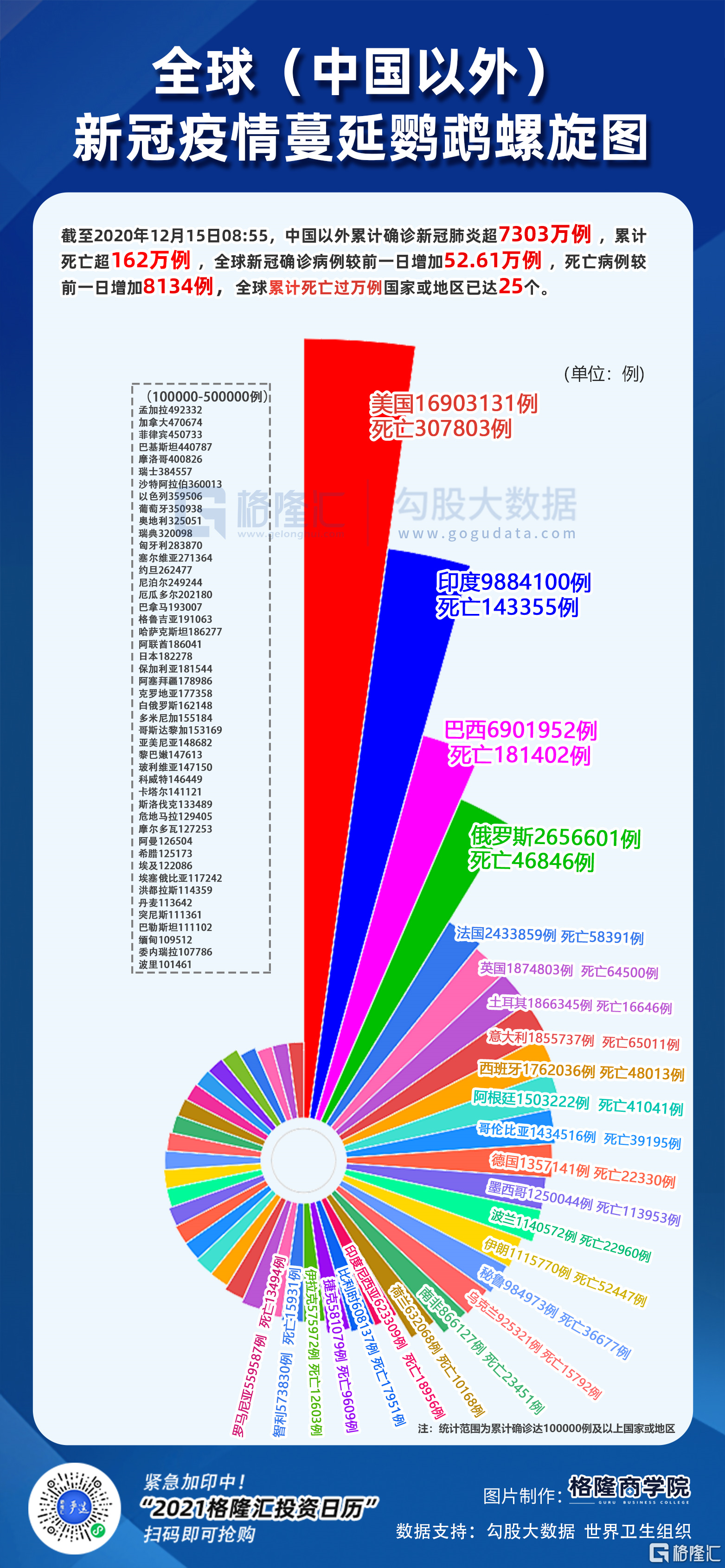 截至2020年12月15日08:55,中国以外累计确诊新冠肺炎超7303万例 ,累计死亡超162万例 ,全球新冠确诊病例较前一日增加52.61万例 ,死亡病例较前一日增加8134例,全球累计死亡过万例国家或地区已达25个。