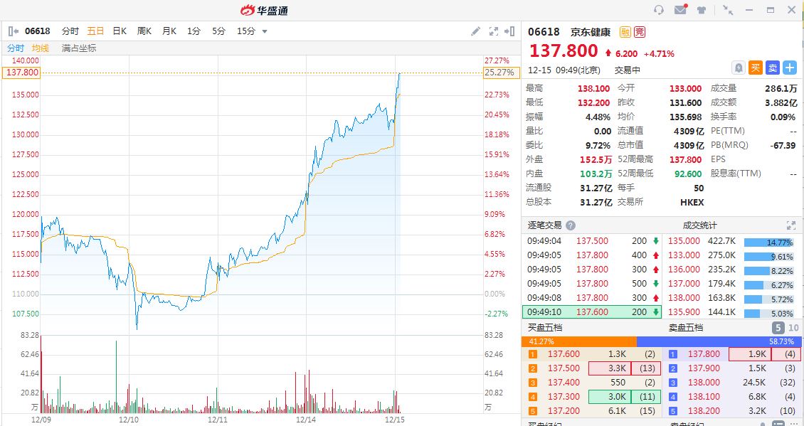 12月8日京东健康登陆港交所,开盘价每股94.5港元。在上市首日,收盘价就达到110港元,市值达3440亿港元,一天就赶超阿里健康市值,成为互联网医疗市值最大公司。