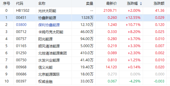 华盛资讯12月15日消息,光伏太阳能板块个股涨幅强势。截止发稿,协鑫新能源大涨12.55%领涨板块,保利协鑫能源涨10.71%,刷新52周新高,半年累计涨幅超400%,卡姆丹克太阳能涨8.20%,阳关能源涨3.70%,顺风清洁能源涨3.30%,北控清洁能源涨2.30%。