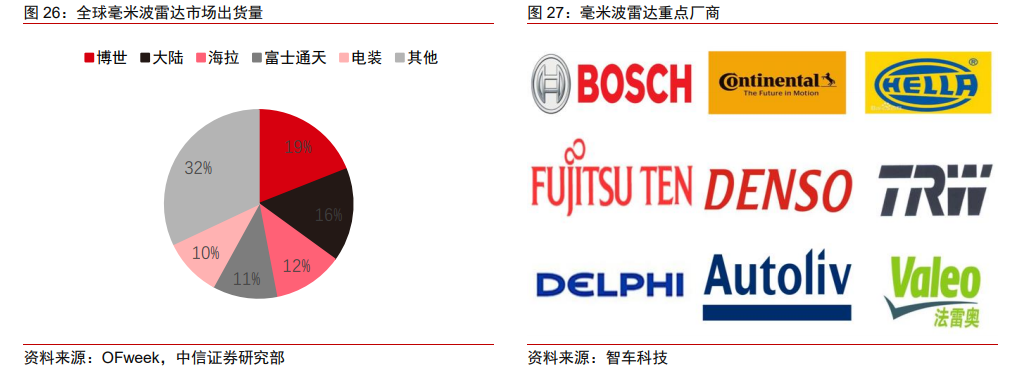 毫米波雷达关键技术被外商垄断,市场集中度较高。在全球毫米波雷达市场上,占主导地位的是德国、美国、日本等国家,主要厂商包括博世、大陆集团、海拉、德尔福(DLPH)、富士通天、电装等。