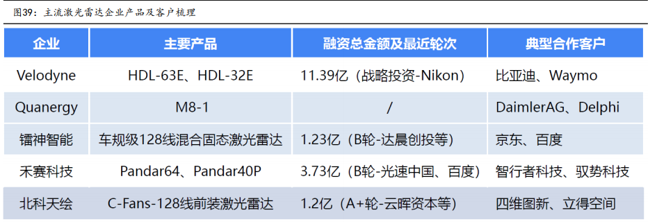 车规级激光雷达的参与者主要是 Velodyne(VLDR),其产品主要包括64线、32线、16线,官方定价分别为8万美元、4万美元和8千美元。 产品售价之所以高昂,在于算法型公司向更高级别研发中,需求刚性+Velodyne强研发能力共同决定。国内参与激光雷达研发的企业包含禾赛科技、北科天绘、镭神智能等,北科天绘目前布局了包含激光雷达芯片在内的自研产品,镭神智能也发布了多线及固态激光雷达专用芯片。