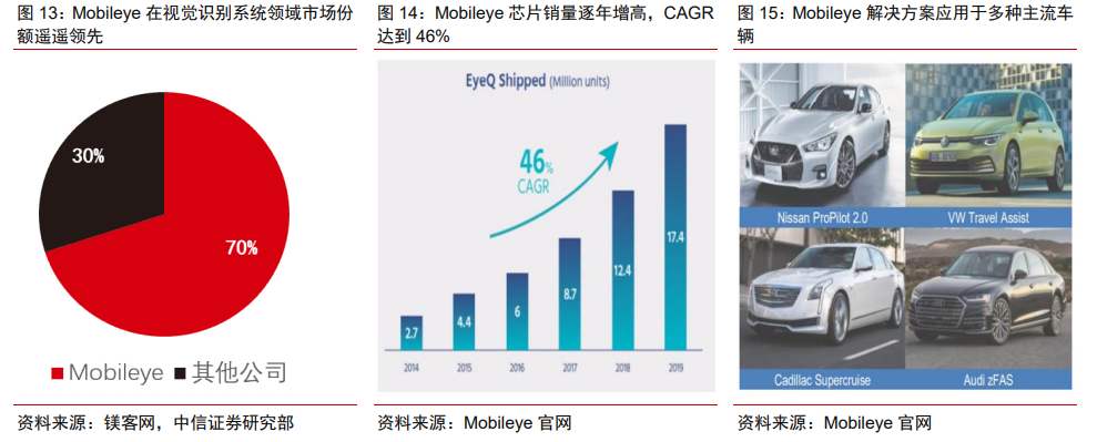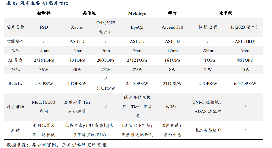 2)Mobileye 背靠英特尔(INTC)的汽车 AI 芯片龙头,生态封闭,占据 L3 以下市场,对外提供算法+芯片解决方案,黑盒模式或影响长期发展;