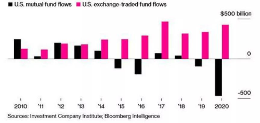 彭博社写道,这种截然不同的命运是结构性转变的一部分,在超低费用和税收优惠的吸引下,投资者连续九年青睐ETF,而不是共同基金。