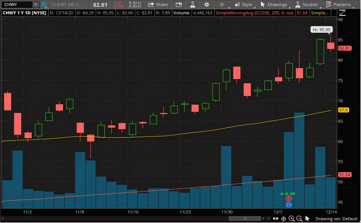 Chewy (CHWY)是一家宠物食品和其他宠物相关产品的电子商务公司。这家总部位于佛罗里达的公司是全球宠物父母和合作伙伴值得信赖的在线目的地。公司致力于产品创新,不断努力寻找新的更好的方式来提高客户的体验。Chewy的股票仅上个月就上涨了30%以上。