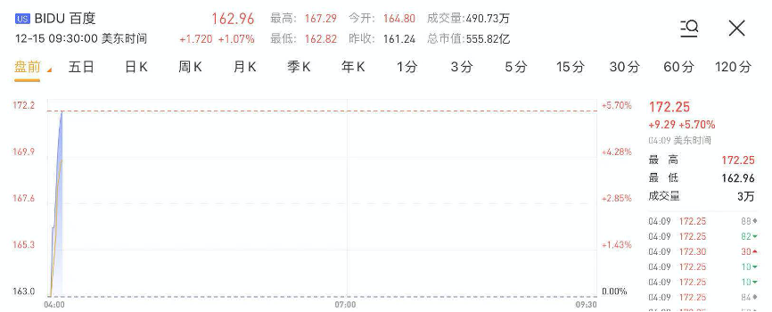华盛资讯12月5日讯,截至发稿,百度盘前大涨近6%。消息面上,传百度将与数家车企商谈组建电动汽车合资企业。