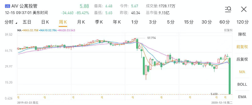 华盛资讯12月15日讯,因遭标普500指数开除,公寓投管公司(AIV)开盘暴跌超85%!截止发稿,公寓投管跌85.42%,现报5.88美元,当前总市值仅余9.15亿美元。值得注意的是,替代公寓投管进入标普500指数的是特斯拉。