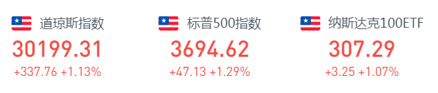 截至收盘,道琼斯指数涨337.76点,涨幅1.13%,报30199.31点;标普500指数涨47.13点,涨幅1.29%,报3694.62点;纳斯达克综合指数涨155.02点,涨幅1.25%,报12595.06点。