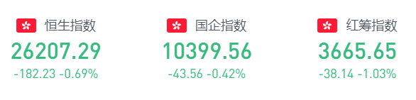 周二,恒指早盘涨0.11%,开盘后急挫逾250点,随后维持窄幅震荡。截至收盘,恒生指数跌182.23点或0.69%,报26207.29点,全日成交额达1440.07亿。国企指数跌0.42%,报10399.56点,红筹指数跌1.03%,报3665.65点。