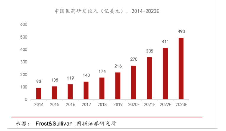 Frost&Sullivan数据显示,2014-2019年,我国医药研发投入由93亿美元增长至216亿美元,年均复合增长率达到18.6%,医药行业研发投入的较快增长构成了国内CRO产业快速发展的基本盘。