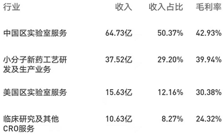 目前,药明康德主营业务共分为中国区实验室服务、合同生产研发/合同生产服务(CDMO/CMO)、美国区实验室服务、临床研究及其他CRO服务四大类。其中,中国区实验室服务主要提供临床前的化学和生物研究服务,2019年营业收入达到64.73亿元,收入占比达到50.37%。
