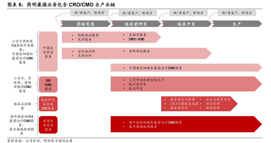 2014年以前,药明康德小分子药物发现业务主要来自国际巨头。2015年开始,仿制药的压力和创新药的红利持续推动国内药企创新转型,国内市场开始迎来快速增长期。与此同时,药明康德也将自身业务不断向产业链下游扩展,公司临床CRO服务正在快速发展。此外,公司还通过美国区实验室在境外提供医疗器械检测及细胞和基因治疗的研发生产服务。