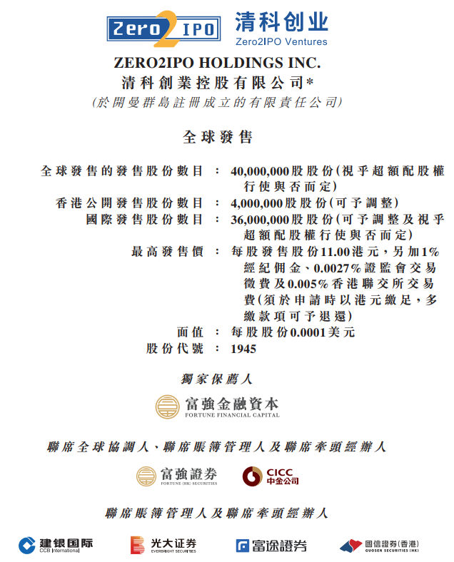 清科创业(01945)今日起至12月21日招股,拟发行4000万股,其中公开发售占比10%,国际配售占比90%,另有15%超额配股权,每股发行价为9.00-11.00港元,每手400股,入场费约4,444港元,预期将于2020年12月30日上市买卖。