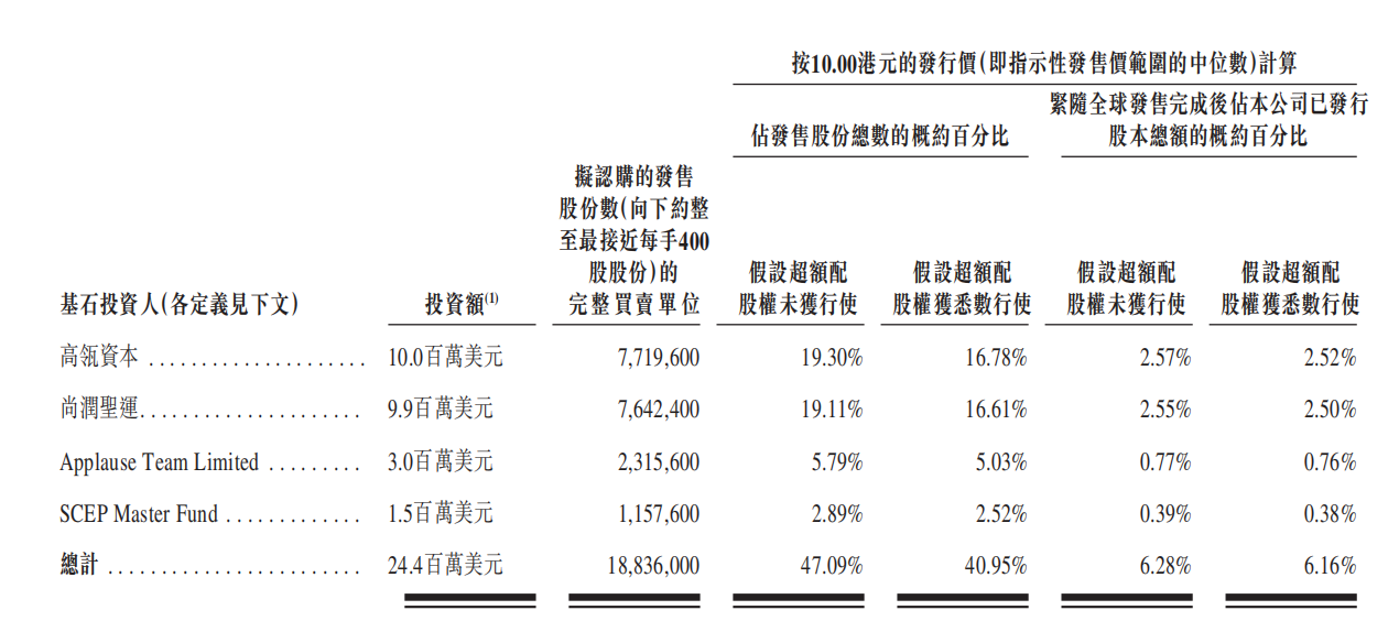 公司已与基石投资人订立基石投资协议,基石投资人已同意在若干条件的规限下认购合共约2440万美元的若干数目发售股份,其中高瓴资本认购1000美元,尚润圣运认购990万美元,Applause Team Limite认购300万美元、SCEP Master Fund认购150万美元。按发行中间价计,基石认购比例占47.09%。