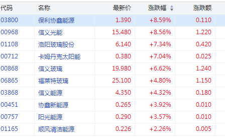 12月16日消息,光伏概念股再度飙升,保利协鑫大涨8.59%,信义光能涨超8.56%,信义玻璃涨6.62%,福莱特玻璃涨4.8%。