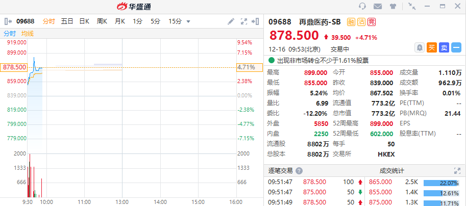 华盛资讯12月16日讯,再鼎医药-SB早盘快速拉升,一度涨超6%,创下历史新高,最高见899港元,现涨幅收窄至4.71%,报878.5港元,总市值773.2亿港元。