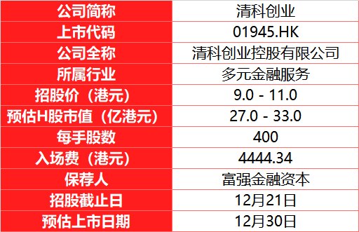 根据港交所最新公告,清科创业将12月16日至12月21日招股,拟发行4000万股,其中公开发售占比10%,国际配售占比90%,另有15%超额配股权,每股发行价为9.00-11.00港元,每手400股,入场费约4,444港元,预期将于2020年12月30日上市买卖。