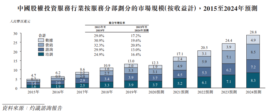 从行业来看,中国股权投资服务行业处于早期且快速成长的阶段,2019年市场规模为130亿元,近五年复合增长率达到29%,而数据服务、营销服务、咨询服务及培训服务市场规模分别为20亿元、33亿元、39亿元及39亿元,近五年复合增长率分别为29%、30.9%、32.3%、29.9%及24.9%。