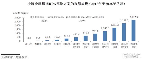 据灼识咨询,中国RPA解决方案市场规模,预计于2019至2026将以约36.0%复合年增长率增至27.12亿元。