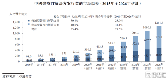 整个行业来看,中国医疗IT解决方案行业目前处于发展中阶段,未来市场的增速快、规模大,但竞争格局高度分散,当下不失为攻城略地的良机。据灼识咨询,受益于中国改善医疗质量及解决医疗资源分配的社会需求,以及《关于加强三级公立医院绩效考核工作的意见》等相关政策要求,预计创新型医疗IT解决方案的市场规模持续扩大,于2026年增长至7781亿元人民币(占同年医疗IT解决方案市场规模的61.7%),2019年至2026年复合年增长率为31.1%。
