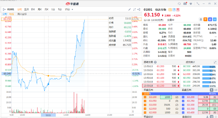 信达生物(1801.HK)出现一波直线拉升走势,大涨超4%。