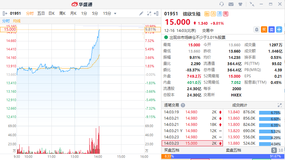 华盛资讯12月16日讯,锦欣生殖盘中异动,午后直线飙升近10%,刷新52周新高。截至发稿,锦欣生殖大涨9.81%,现报15.00港元,当前成交额1.846亿港元,总市值为364.4亿港元。