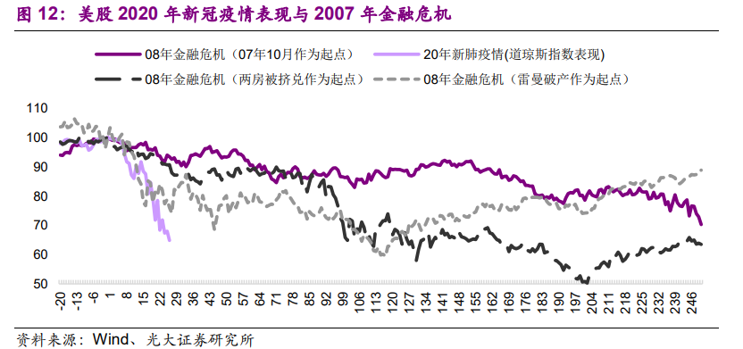 从下跌幅度上看,道琼斯指数自2月13日以来的27个交易日累计下跌34.7%,和1929年9月3日之后50个交易日下跌 48%、2008 年9月15日之后49 个交易日下跌 34%、2000 年 3 月 19 日之后纳斯达克指数 26 个交易日下跌 34%的同样短时间快速的下跌很相似,都反映了初期投资者恐慌的结果。此次美股恐慌,从幅度上来看,堪称“史诗级”,丝毫不亚于金融危机。