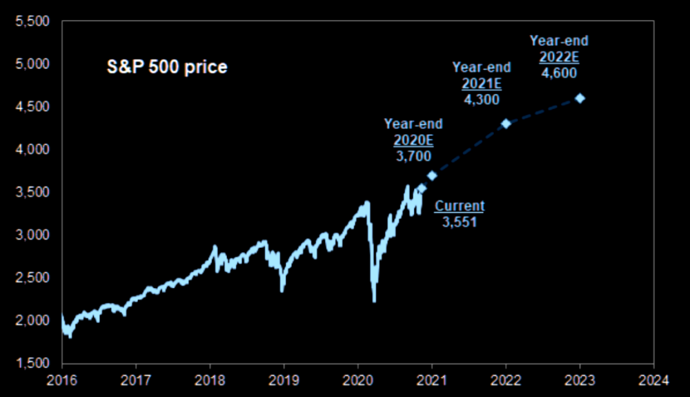 Kostin预测,2020,2021和2022年底,标普500指数将分别在3700美元,4300美元和4600美元。