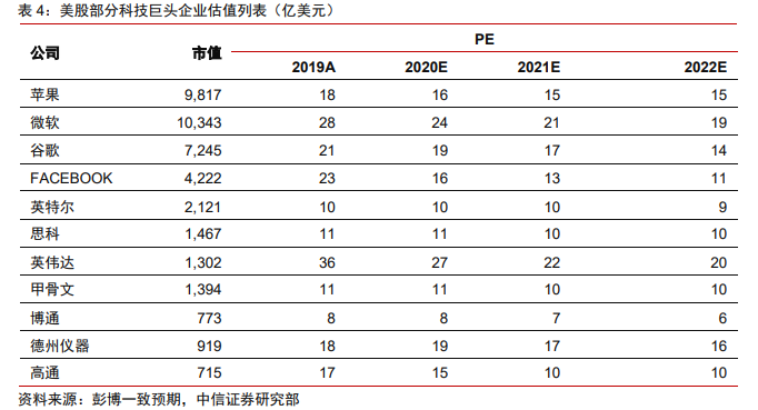 主要市场指数从高点累计下跌 30%左右,创下自 2018 年 10 月以来的最大跌幅。科技板块亦跌幅明显,部分代表性科技龙头苹果、微软、谷歌、亚马逊、facebook 等个股均有 10%~30%不等跌幅,它们的估值也因此折半(如上图)。