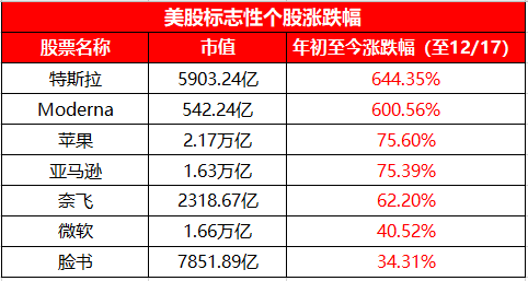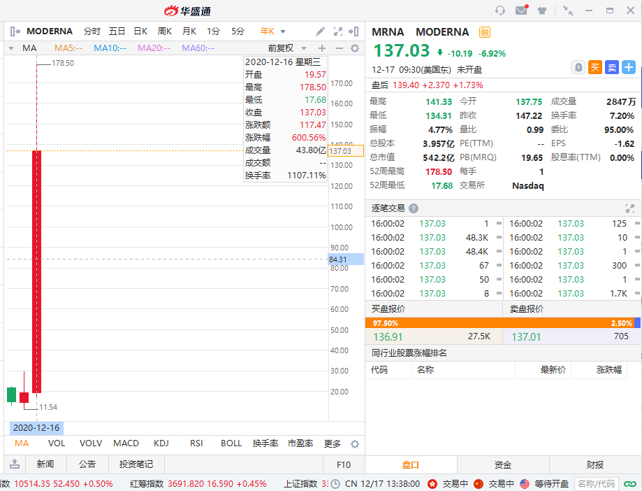 11月16日,辉瑞之后,Moderna也带来了疫苗的好消息,其实验性疫苗三期试验有效率高达94.5%。当日该股拉升,收涨9.58%,报97.95美元,美股同时也迎来大涨。从年初截止年底(12月17日),Moderna的涨幅高达600.56%。