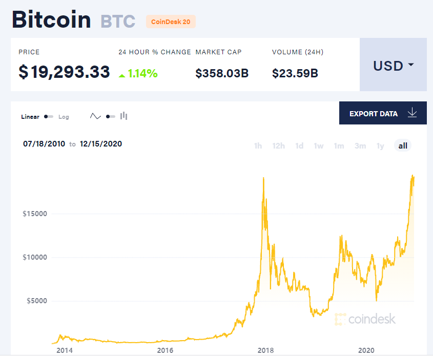 比特币一直饱受争议,没有一个解释能让所有人满意。但今年以来,比特币似乎变成表现最好的资产。随着 Paypal 开放加密货币购买服务, 加密市场的交易量和关注度节节攀升,12月初,比特币价格创下19844美元的历史新高,超过了2017年12月创下的历史高点。尽管此后有所回落,但目前仍有望冲击20000美元的大关。