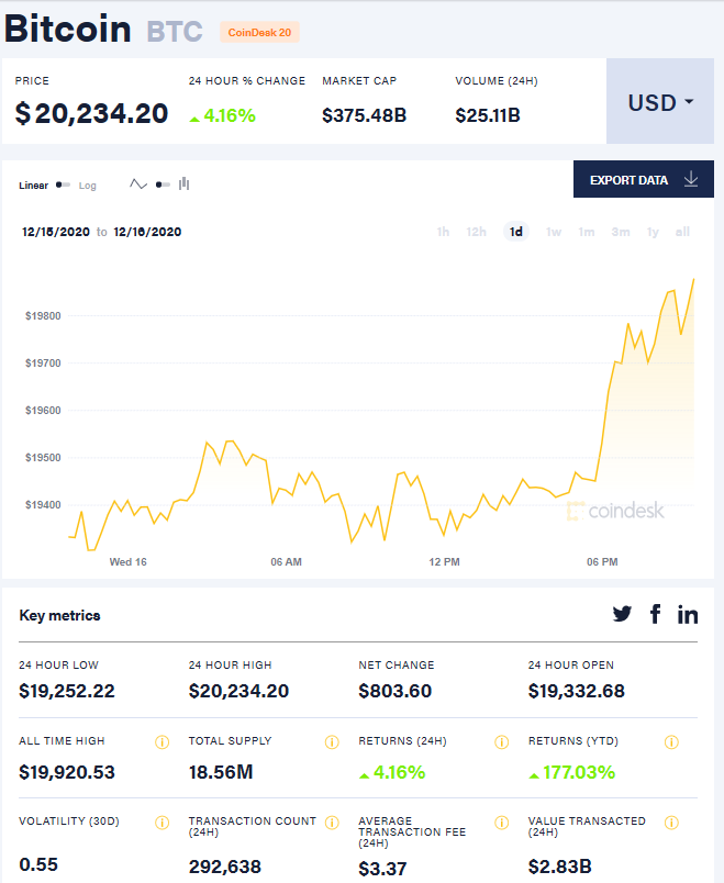 12月16日晚间,比特币首次站上20000美元。根据比特币新闻资讯网Coindesk价格,截至发稿,比特币价格约为20234美元,24小时内涨幅达4.16%,24小时内比特币成交额为251.1亿美元,市值为3754.8亿美元。