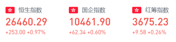 周三,恒指早盘涨0.82%,全天呈窄幅震荡走势。截至收盘,恒生指数涨253点或0.97%,报26460.29点,全日成交额达1290.39亿。国企指数涨0.6%,报10461.9点,红筹指数涨0.26%,报3675.23点。