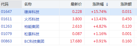 今早港股区块链概念股集体大涨。其中,雄岸科技涨15.74%,火币科技大涨13.43%,柏能集团涨4.82%。