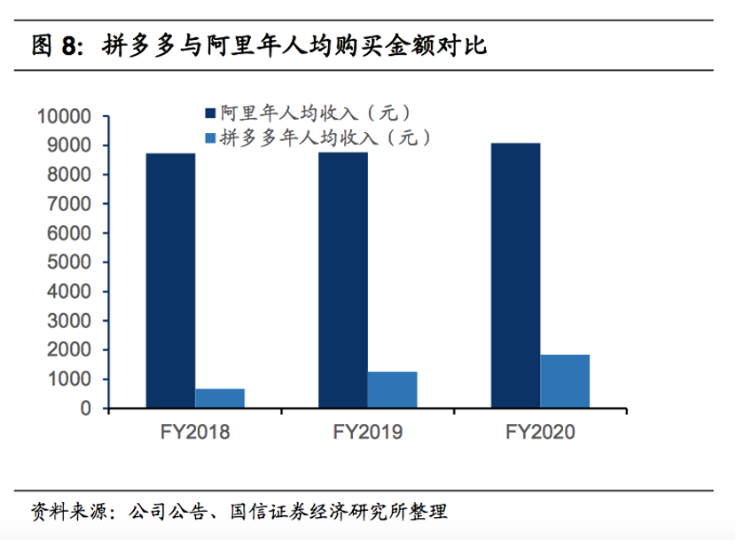 在获客成本上,依托微信生态的拼多多仅为200元左右,相比获客成本超过1000元的阿里保持一定优势。