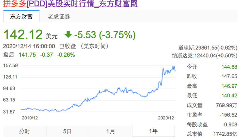 2020年11月12日,拼多多发布的第三季度财报显示,公司Q3净利润超4.6亿元,首次实现季度盈利,期间营收为142亿,同比增长89%。受此消息影响,拼多多股价随后快速上涨,达历史最高点156美元,公司市值约为1.2万亿人民币。