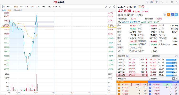 君实生物医保谈判不容乐观,媒体人形容君实生物方面“面无表情,匆匆离开”,公司股价一度跌超7%,此后获得多个大单买盘涌入,其中,一个买盘买入3.48万股,涉资152万港元。