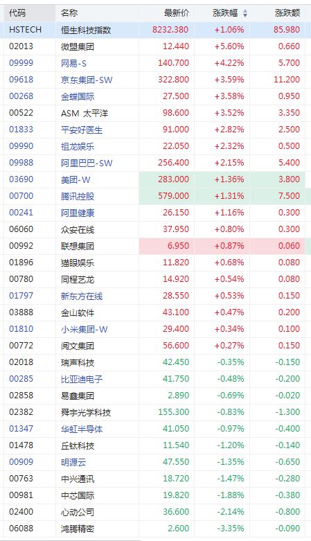 SAAS概念微盟集团涨超5%领涨指数成分股,网易涨超4%,京东、金蝶国际、ASM太平洋涨超3%,京东市值重返万亿港元。