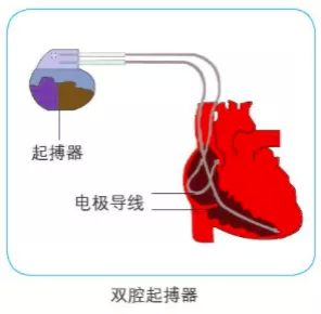 双腔起搏器则通常是将电极导线与右心耳和右心室连接。适用于病窦综合征、房室传导阻滞、阵发性房颤、肥厚梗阻型心肌病及血管迷走性晕厥(心脏抑制型)患者。