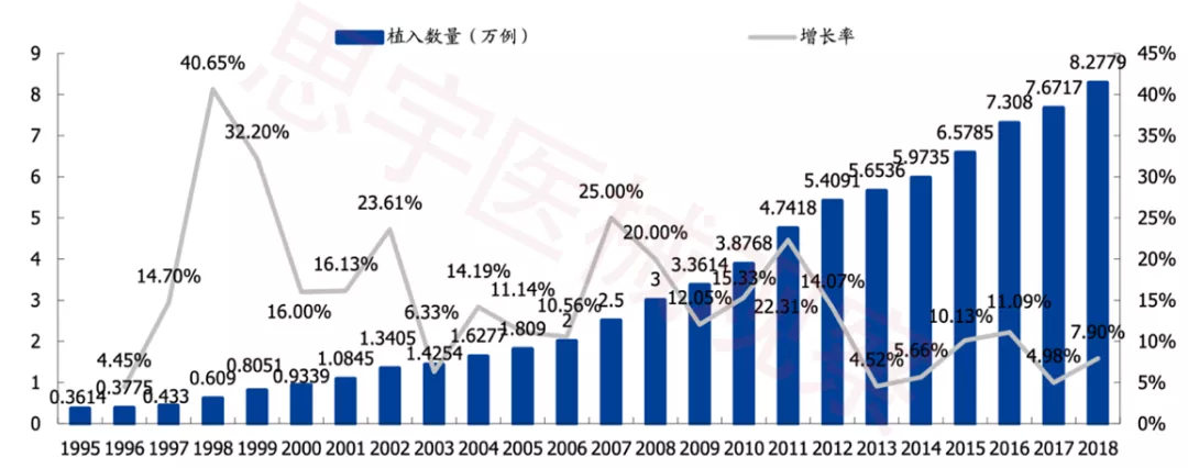 (图:中国心脏起搏器年植入量(1995-2018年))