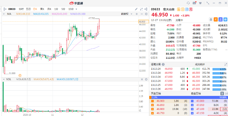 农夫山泉(09633-HK)涨3.13%,现报46.95港元,盘中高见47.7港元,目前市值达到5280亿港元。