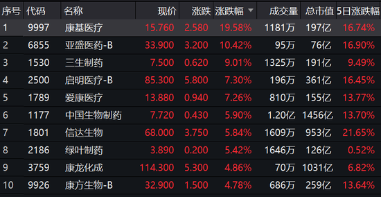 近期医药股集体爆发,今日医药股更是全面上涨。康基医疗涨近20%,亚盛医药涨超10%,三生制药涨超9%,启明医疗、爱康医疗涨超7%,中国生物制药、信达生物、绿叶制药涨超5%。康龙化成、康方生物、康希诺等涨超4%。不过,君实生物盘中一度跌超7%,引发市场热议,同样百济神州涨幅也受限。