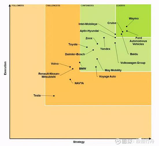 根据Navigant Research 2020年3月发布的自动驾驶竞争力榜单显示,第一梯队的四家公司分别是Waymo、Cruise、百度以及Ford Autonomous Vehicies。