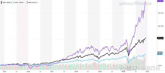 据房东看世界报道:在上面这张图中紫色线为Catherine Wood管理的一只规模最大的ARKK与纳斯达克100(黑色线)以及标普500(黑色)的对比,从2014下半年登场至今,ARKK累计上涨了接近500%,上涨表现碾压基准标普500,甚至也让作为科技指数之王的纳斯达克100相形见绌。