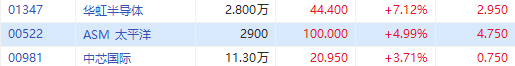 华盛资讯12月17日消息,芯片概念走高,华虹半导体(01347)升逾7%领涨,截至发稿,华虹半导体涨7.12%,报价44.4港元,ASM太平洋(00522)涨4.99%,报价100港元,中芯国际(00981)涨3.71%,报价20.95港元。