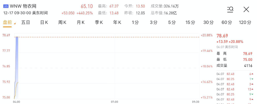 华盛资讯12月17日讯,次新股物农网(WNW)盘前涨超20%,该股昨日收涨440.25%,上市两日涨超1200%。据悉,公司立足家庭健康,构建产销一体化、社区数字化的订单农业生态网。
