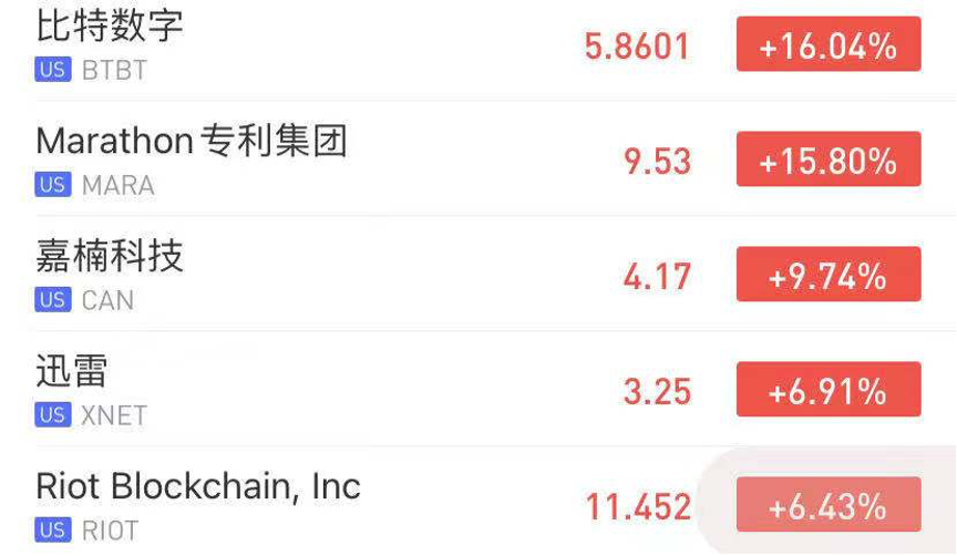 截至发稿,比特数字大涨超16%,Marathon大涨15.80%,比特币矿机生产商嘉楠科技大涨9.74%,迅雷涨6.91%。