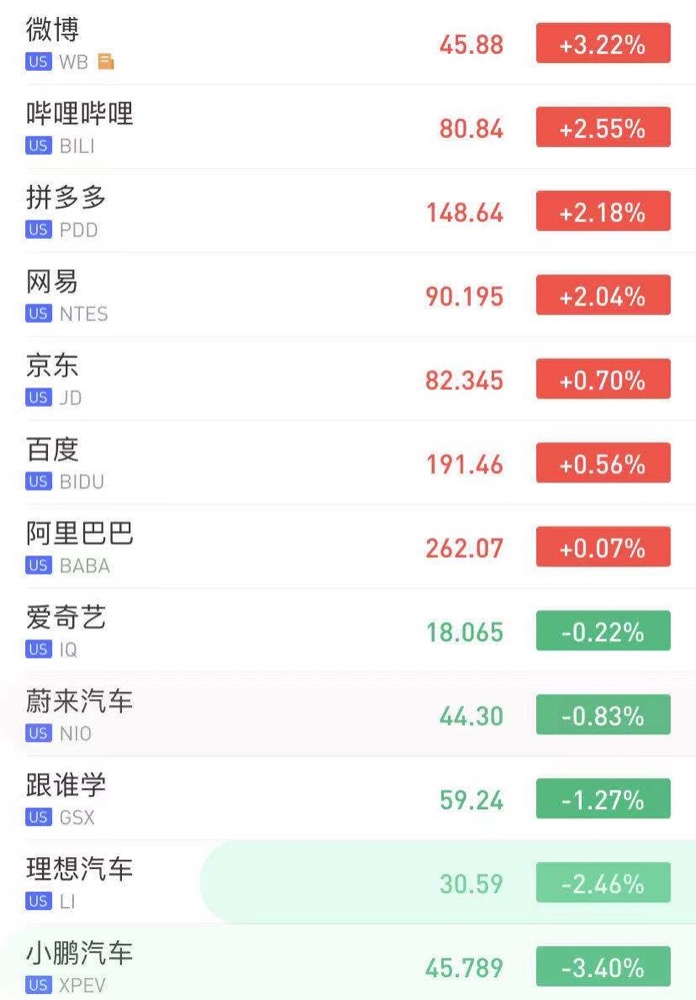 截至发稿,微博大涨3.22%,哔哩哔哩涨2.55%,拼多多涨2.18%,网易涨2.04%。理想汽车跌2.46%,小鹏汽车跌3.40%。