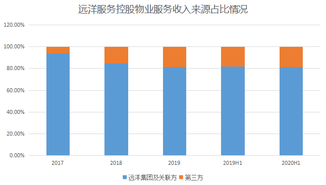 数据显示,远洋服务发展依然紧靠远洋集团,2017年-2019年以及2020年上半年物业管理收入中,来自远洋集团及关联方的占比高达94%、84.5%、81.5%以及81.2%。