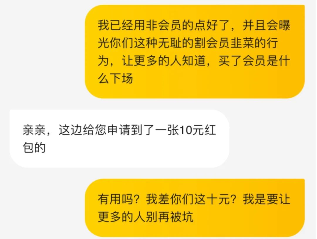 实话说,蜜姐前段时间也充了美团外卖的会员,用了几天发现不对劲,就放弃转投另一家。彼时我没有想到要曝光什么,习惯性地“忍气吞声”了。今天和小伙伴说起,还被他大骂一顿,批评我不够正义,惭愧……
