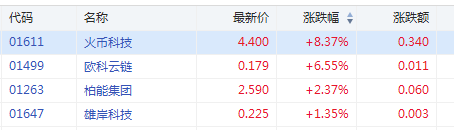 港股区块链概念股继续走强,截至发稿,火币科技(01611)涨8.37%,报4.4港元;欧科云链(01499)涨6.55%,报0.179港元;雄岸科技(01647)涨1.35%,报0.225港元;柏能集团(01263)涨2.37%,报2.59港元